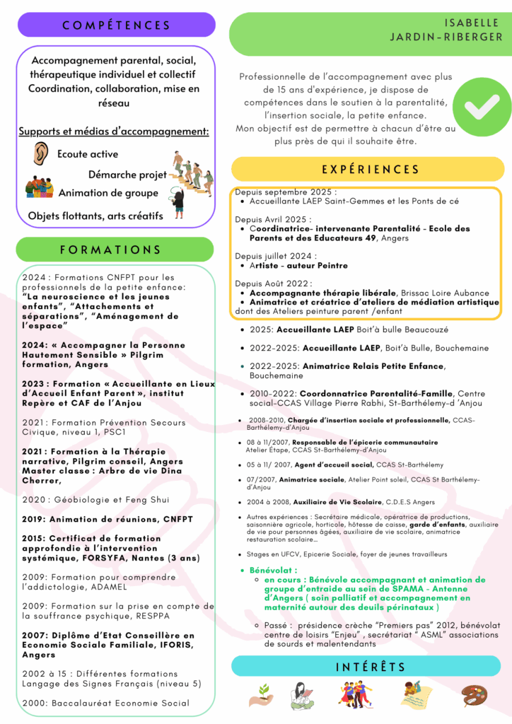 En 2025, je deviens coordinatrice à l’Ecole des Parents et des Educateurs de Maine, tout en restant accompagnante en libéral et accueillante LAEP pour les villes des Ponts de Cé et de Ste- Gemmes sur Loire et bénévoles pour l’association SPAMA ( accompagnement des parents autour du deuil périnatal et soin palliatif des bébés ).